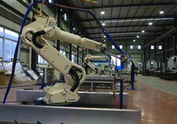 双工位切割机器人工作站主要用于电力机车和煤机产品碳素钢、低合金高强度钢板材坡口的切割加工。为有效提高生产效率,减小工人劳动强度,工作站采用单机器人双工位平行布置方式,即:单套座式切割机器人+双套切割平台。机器人选用日本OTC公司生产的AII-V6L型机器人,工作半径达2006mm。该机器人具有臂伸范围广,负载大等特点,特别适合于切割加工的应用。